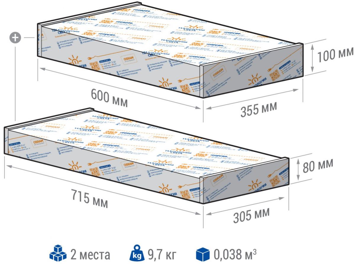 Кривая силы света (КСС): Д (двойная) — распределение светового потока в двух направлениях, что идеально подходит для освещения высоких пространств и проходов между стеллажами.