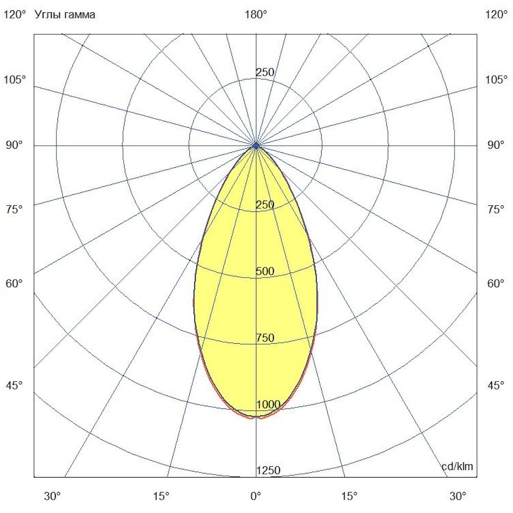 Кривая силы света (КСС): Круговая диаграмма типа Г (по российской классификации) – равномерное распределение светового потока под углом 360°, идеально подходит для акцентной подсветки вертикальных поверхностей.