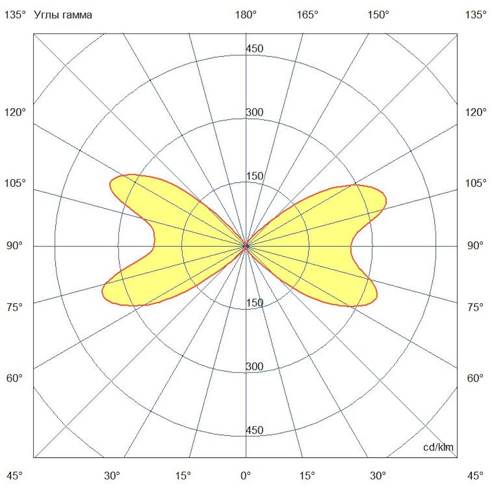 Угол рассеивания 90° обеспечивает равномерное распределение света без потери интенсивности. Такая кривая силы света (КСС) относится к категории «косинусная», что позволяет эффективно освещать вертикальные поверхности и создавать акцентную подсветку фасадов.