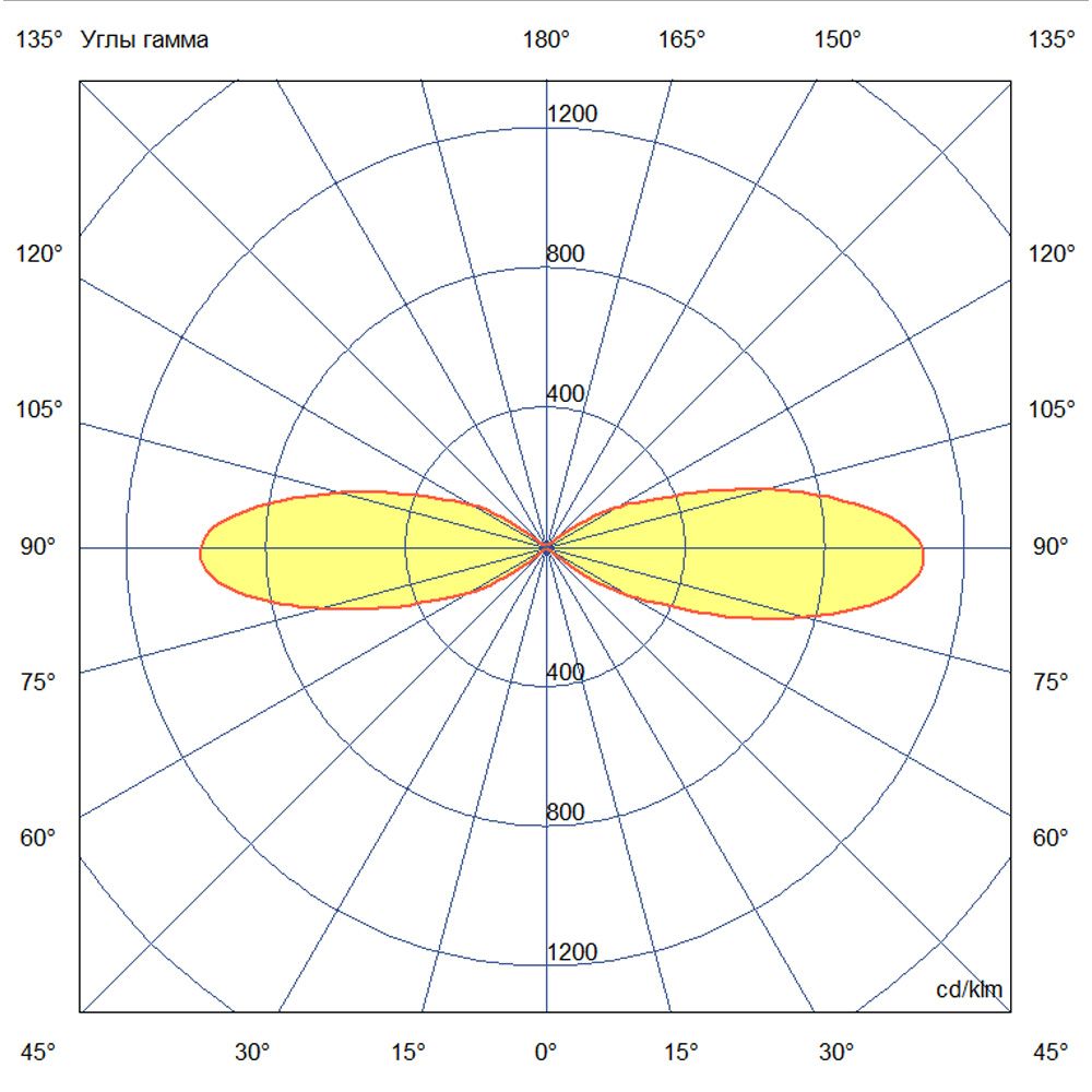 Кривая силы света (КСС) — глубокая симметричная, что обеспечивает равномерное распределение света под углом 40°. Такая диаграмма направлена на создание комфортного освещения рабочих зон без слепящего эффекта. По Российскому стандарту это класс Д3, подходящий для освещения промышленных объектов и общественных пространств.