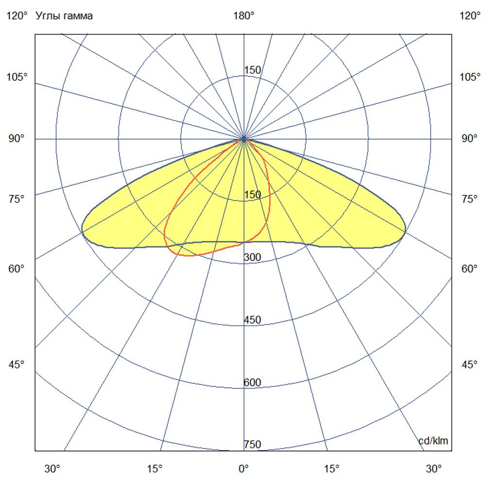 Кривая силы света (КСС) – Двойная асимметричная 155х70°. Такая диаграмма направлена на эффективное освещение протяженных объектов: дорог, проездов, складских помещений. Свет равномерно распределяется по всей длине объекта без образования темных зон.