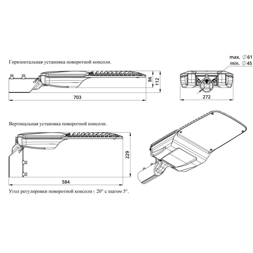 - Угол рассеивания 155х70° формирует эллиптический световой поток, оптимальный для освещения протяженных объектов