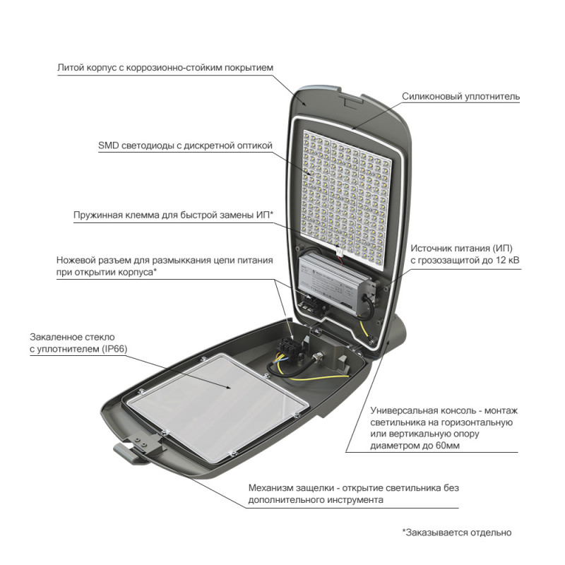 - Кривая силы света (КСС): широкая — предназначена для равномерного освещения больших площадей, соответствует российским стандартам