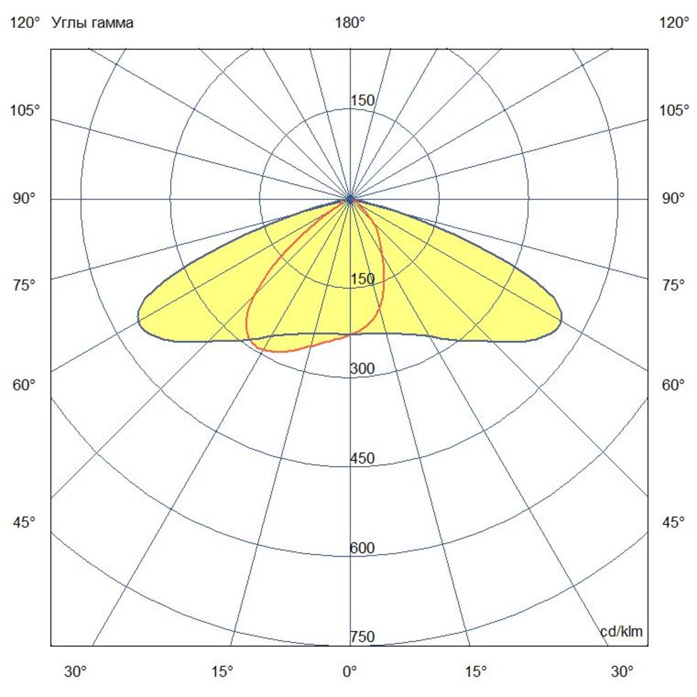 Кривая силы света (КСС) типа Д2: специальная эллипсоидная диаграмма направленности 155х70°. Она специально разработана для равномерного освещения прямоугольных помещений и коридоров. По российской классификации это самая популярная кривая для промышленного освещения.