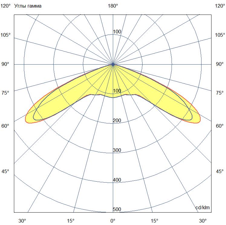- Кривая силы света (КСС): широкая, с углом рассеивания 150° – предназначена для равномерного освещения больших площадей согласно ГОСТу.