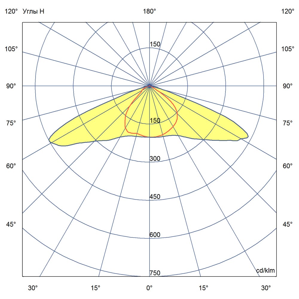 Кривая силы света (КСС) типа «Ш» (широкая) с углом рассеивания 140х85° обеспечивает равномерное освещение больших площадей без слепящих засветок. Соответствует российской классификации для профессионального освещения.