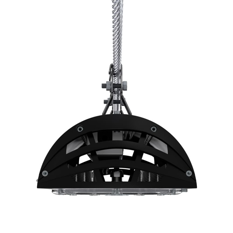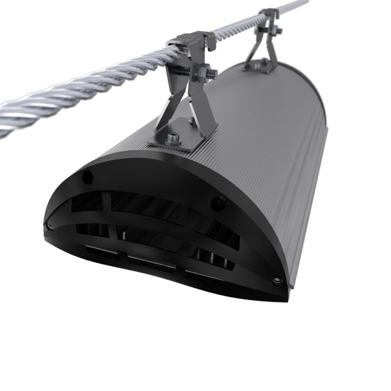 Светильник предназначен для подвесного монтажа на тросах, что значительно упрощает установку и обслуживание. Конструкция позволяет легко регулировать высоту подвеса, адаптируясь под конкретные условия объекта. Корпус выполнен из анодированного алюминия, который не подвержен коррозии и механическим повреждениям.