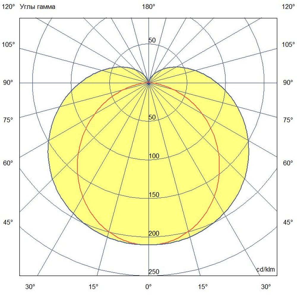 Кривая силы света (КСС): Широкая равномерная кривая обеспечивает качественное распределение светового потока в большом пространстве. По российской классификации относится к категории Д — для общего освещения больших площадей.