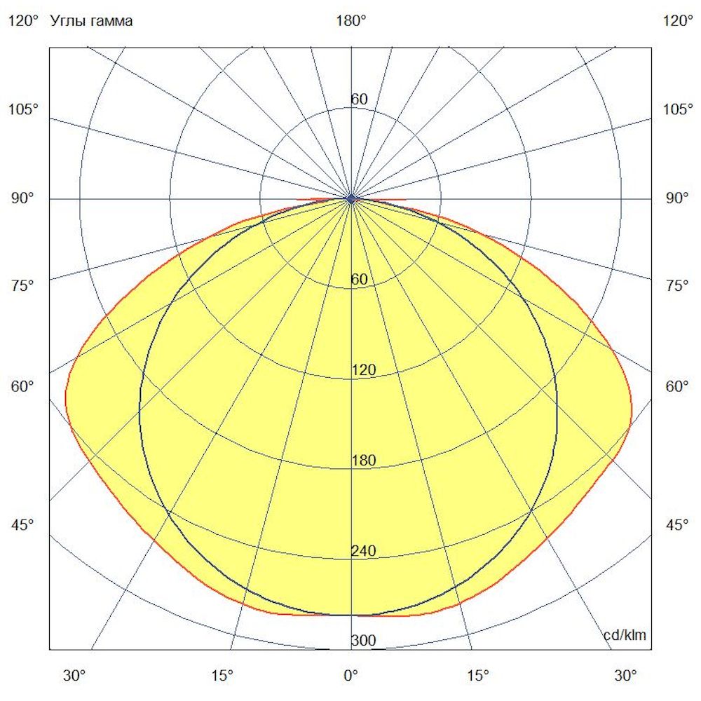 Кривая силы света (КСС) — глубокая широкая. Эта характеристика означает, что свет равномерно распределяется в пределах 120 градусов, создавая комфортное освещение без резких перепадов яркости. Такая КСС особенно эффективна для офисных помещений с высотой потолков до 3,5 метров.