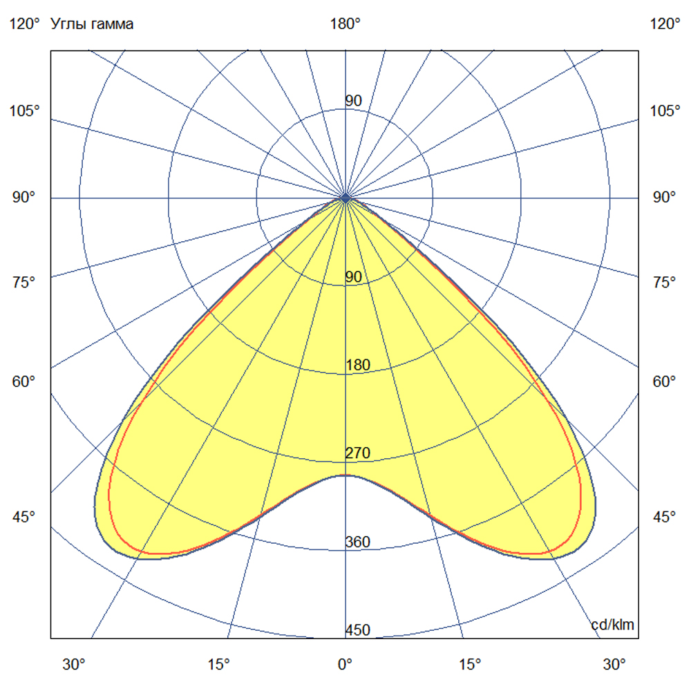 - Кривая силы света (КСС) — Д (двойная). Расшифровка: этот тип диаграммы распределения светового потока идеально подходит для освещения высоких помещений и открытых пространств с равномерным покрытием.