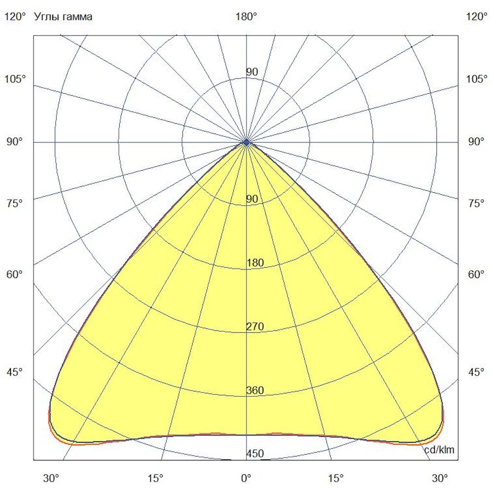 - Кривая силы света (КСС) — «Широкая» — равномерное распределение светового потока в пределах 90°, соответствует российской классификации КСС типа Д2