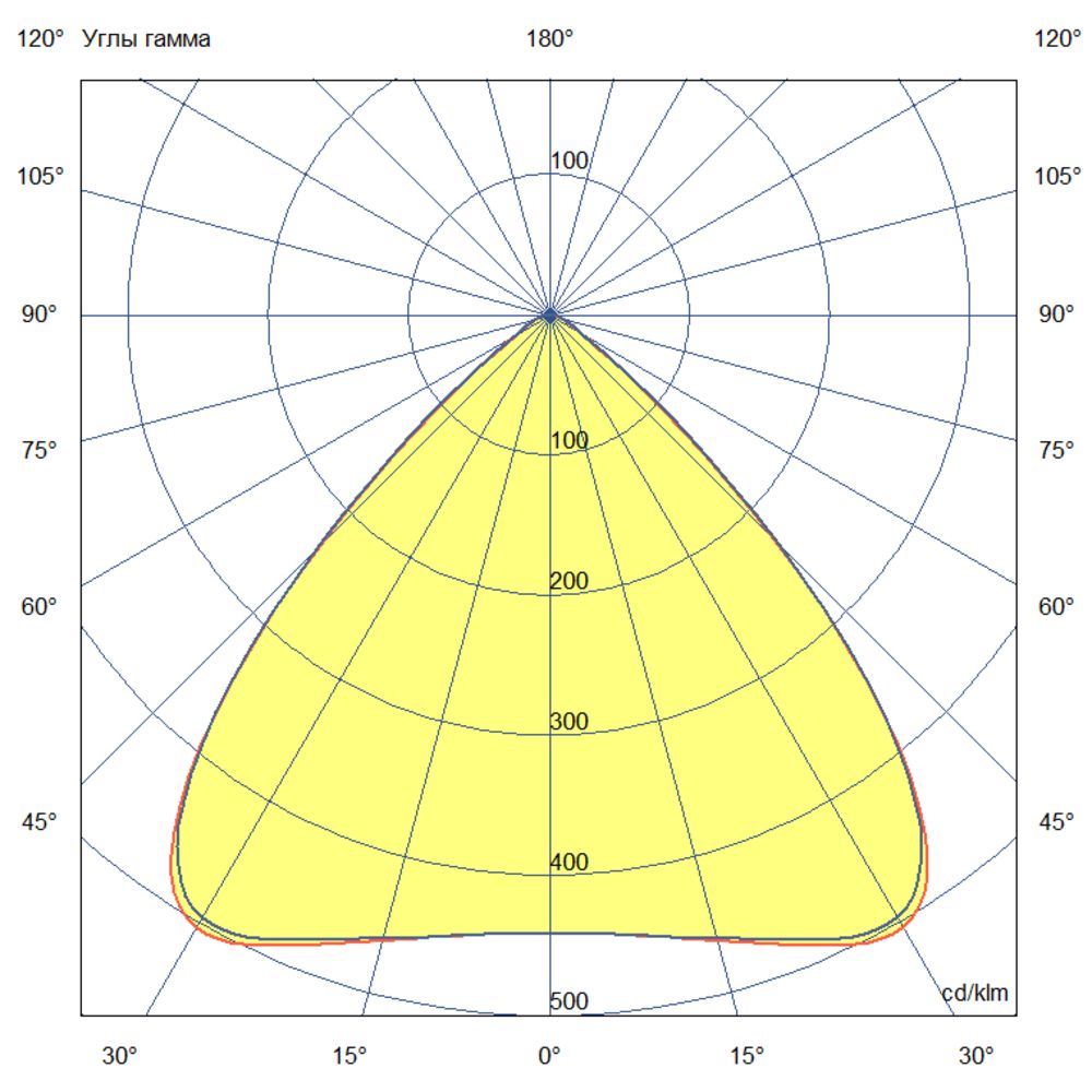 Кривая силы света (КСС) – глубокая. Такая диаграмма распределения светового потока предназначена для освещения пространства с высокими потолками и большими площадями. По российской классификации это соответствует светильникам с концентрированным светораспределением.