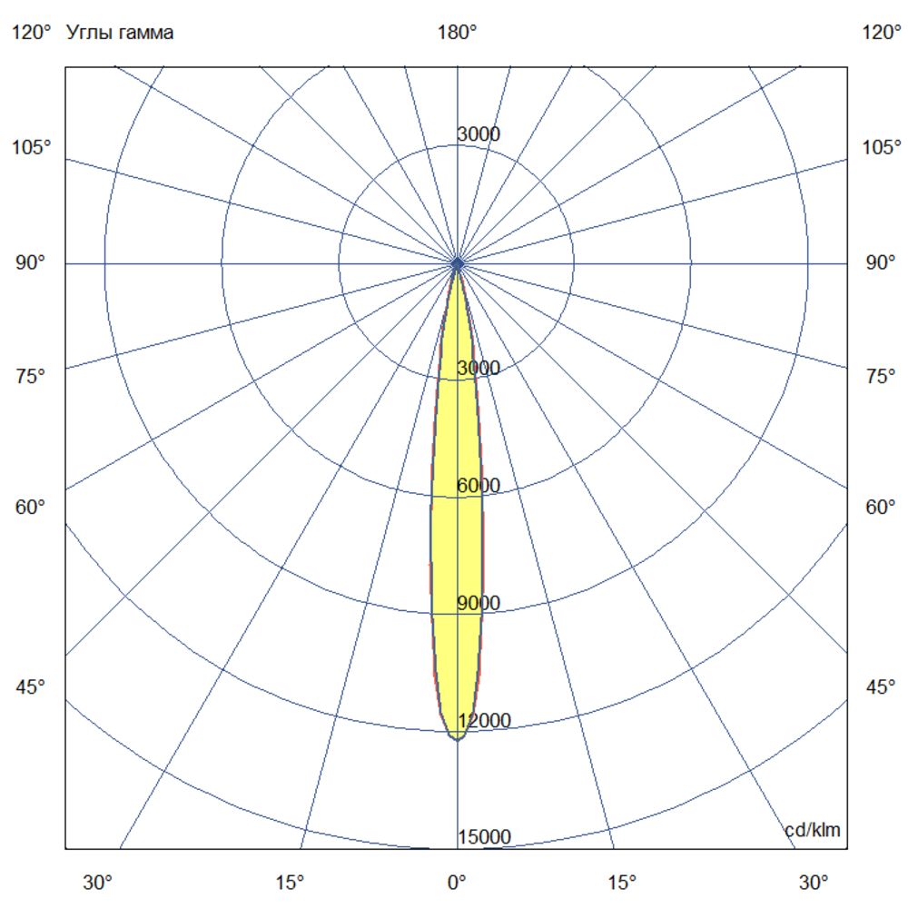 Кривая силы света (КСС): узкоконцентрированная – по российской классификации относится к типу Г, что обеспечивает максимальную концентрацию светового потока в заданном направлении.
