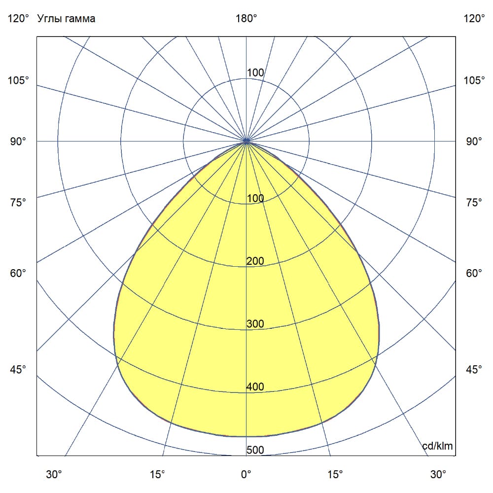 Кривая силы света (КСС) – глубокая широкая. Такая диаграмма распределения светового потока идеально подходит для освещения пространств высотой 6-12 метров, равномерно распределяя свет по всей площади.