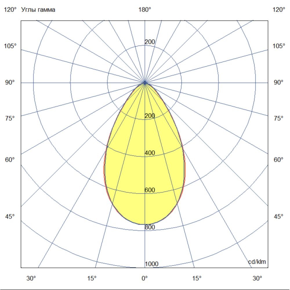Кривая силы света (КСС) — широкая овальная характеристика. Это распределение светового потока позволяет эффективно освещать пространство под светильником и вокруг него. Такая диаграмма особенно подходит для производственных цехов, складских помещений и спортивных сооружений, где важна равномерность освещения всей площади.