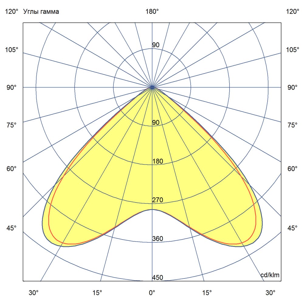 Кривая силы света (КСС): широкая — согласно российской классификации, обеспечивает равномерное распределение света в пределах 90°, что делает светильник универсальным решением для различных задач освещения.