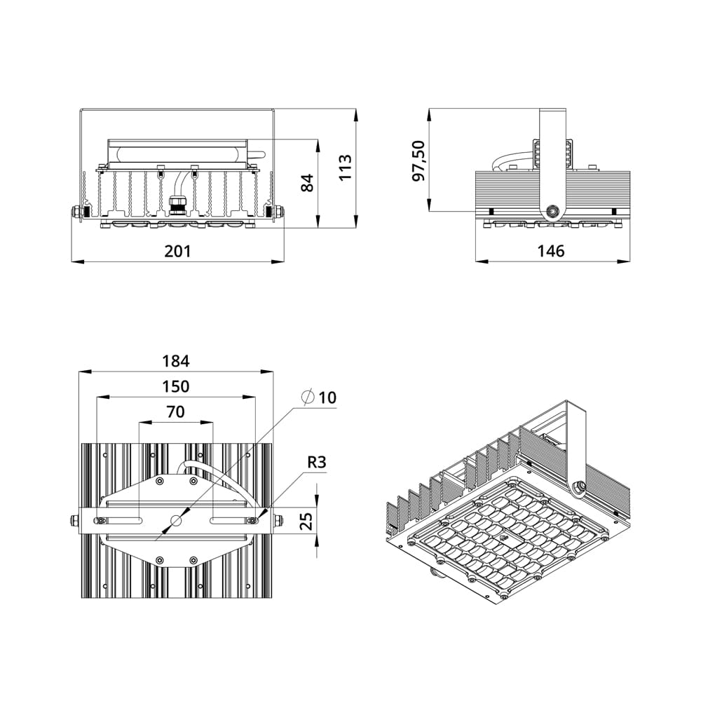 - Класс пылевлагозащиты IP65: полная защита от пыли и струй воды с любого направления. Позволяет использовать прожектор на открытых площадках без дополнительной защиты.