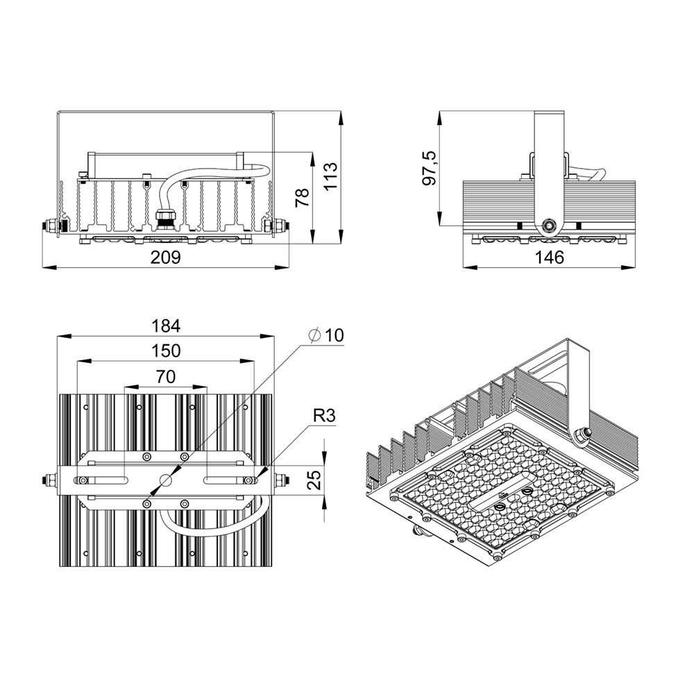 Кривая силы света (КСС) типа «прямоугольник» — распределение светового потока 155х70° создает широкую зону освещения, идеально подходящую для подсветки фасадов, рекламных конструкций и открытых площадок. Такая диаграмма направлена на максимальную эффективность освещения рабочих зон.