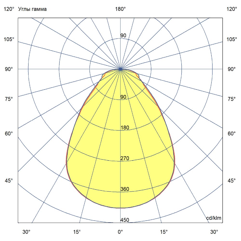 - Кривая силы света (КСС): Косинусная – равномерное распределение света по всей площади, минимальная вертикальная освещенность